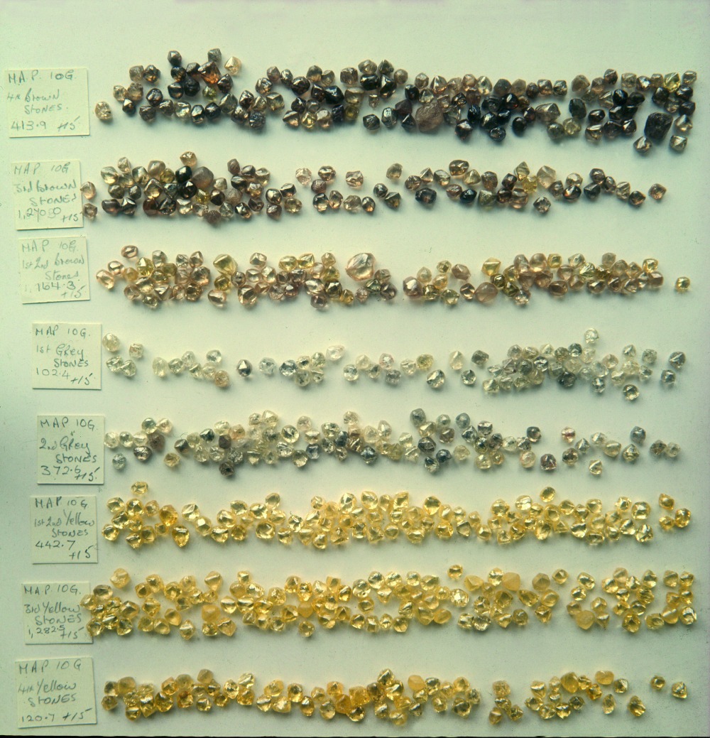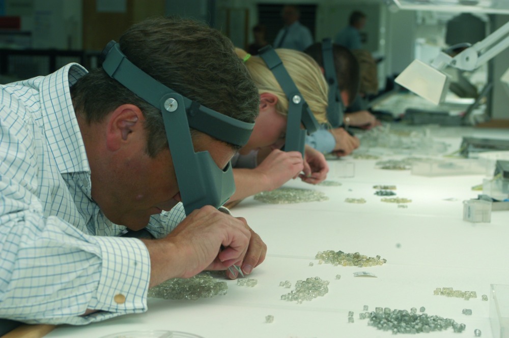 Rough diamonds are sorted by colour and weight into more than 16,000 categories. (De Beers Archives)