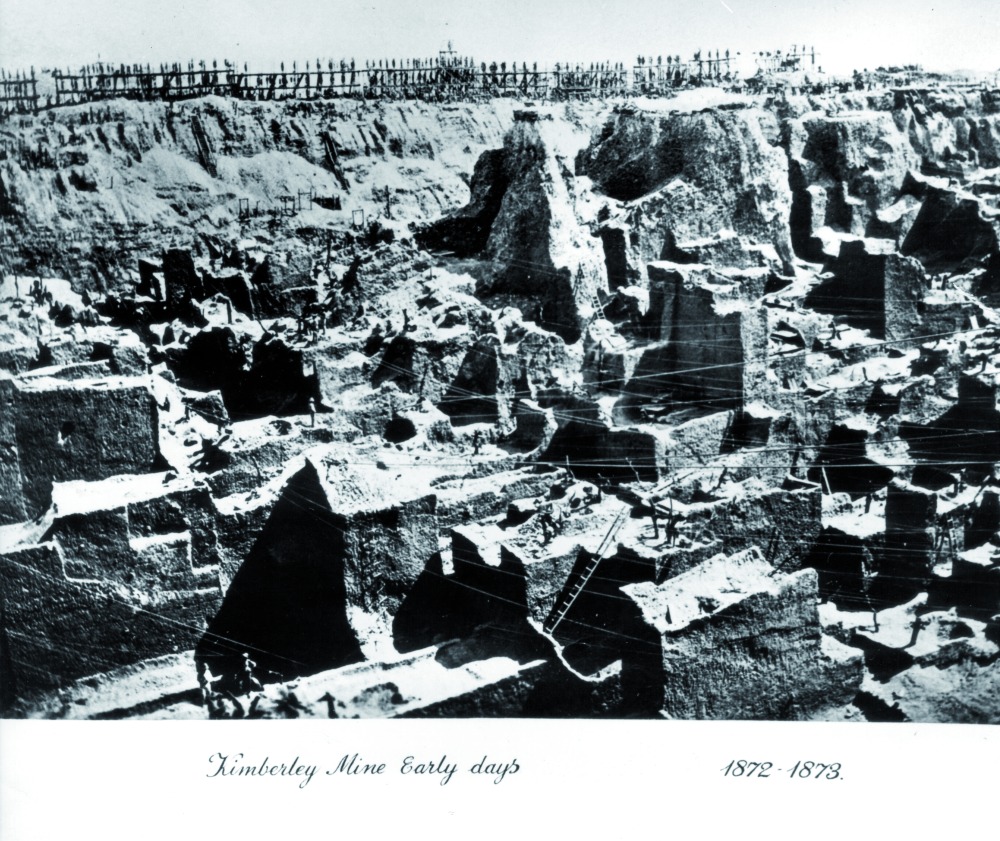 Around 1870, diamond extraction began in Kimberley, with hundreds of adjoining claims 30 feet in size, which, soon enough, were only reachable by cable-lifts. (De Beers Archives)